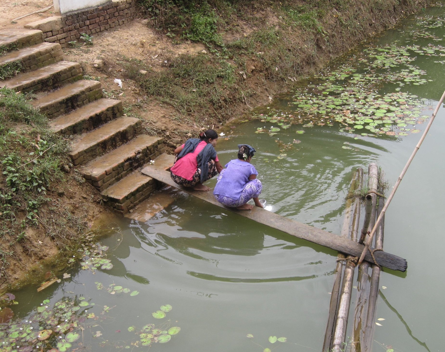 Without access to clean water sources, villagers draw water from a stagnant rainwater pond